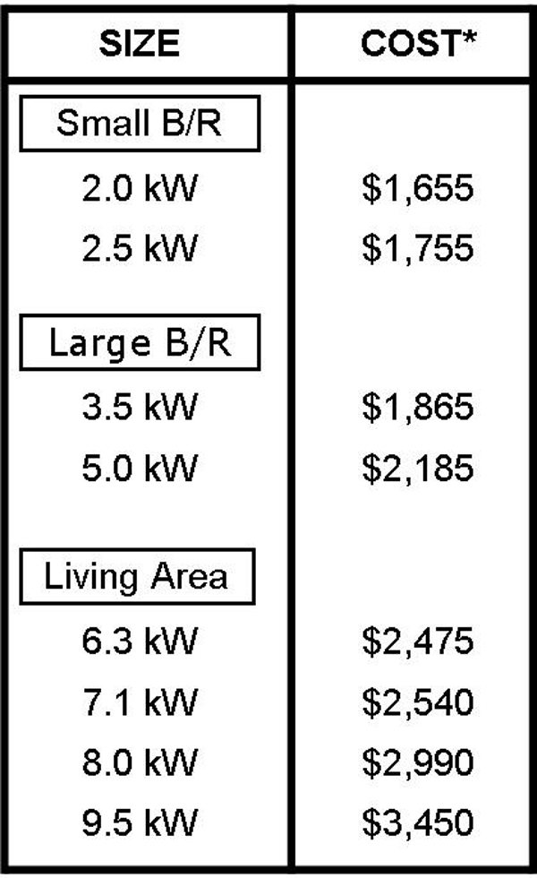 | *Prices will vary if the installation requires the outdoor unit to be wall mounted or on a PVC slab or there are other site issues. | ||
